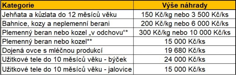 Doporučené ceny ovcí a koz při stanovení výše náhrady škod způsobených zvláště chráněnými druhy živočichů poskytovaných podle zákona č. 115/2000 Sb., v jeho platném znění.