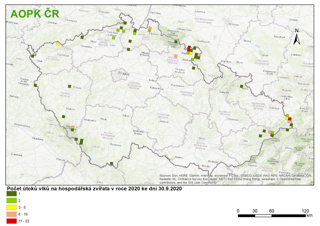 Zahrnuty jsou pouze kraje s hlášenými škodami. Počty jsou evidovány pouze na základě protokolů zaslaných AOPK ČR.
