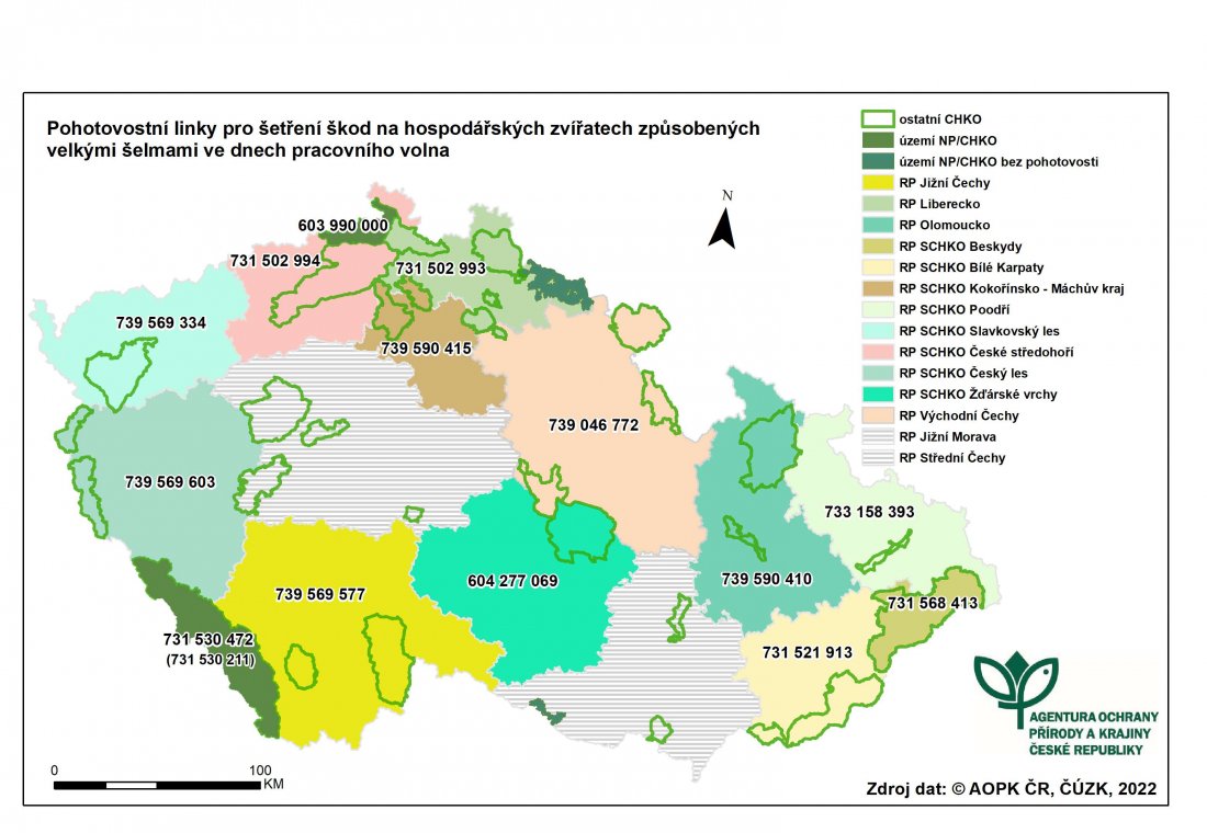 Pro účely šetření škod ve dnech pracovního volna zavádí AOPK ČR pohotovosti, a to i na území mimo CHKO (na území národních parků jsou místní šetření k ohledání škod řešena příslušnou správou NP). Vizualizaci územní působnosti „šelmí“ pohotovosti naleznete zde vč. TELEFONNÍCH ČÍSEL: