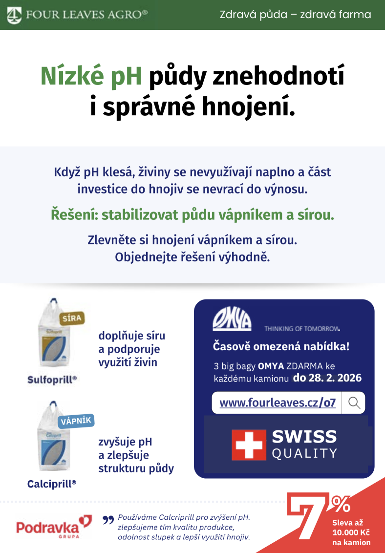 Společnosti Four Leaves Agro zaměřená na výživu rostlin a zlepšování kvality půdy nabízí akci na granulované vápence švýcarské kvality se sírou: sleva 7% platná do 28.2.2026.